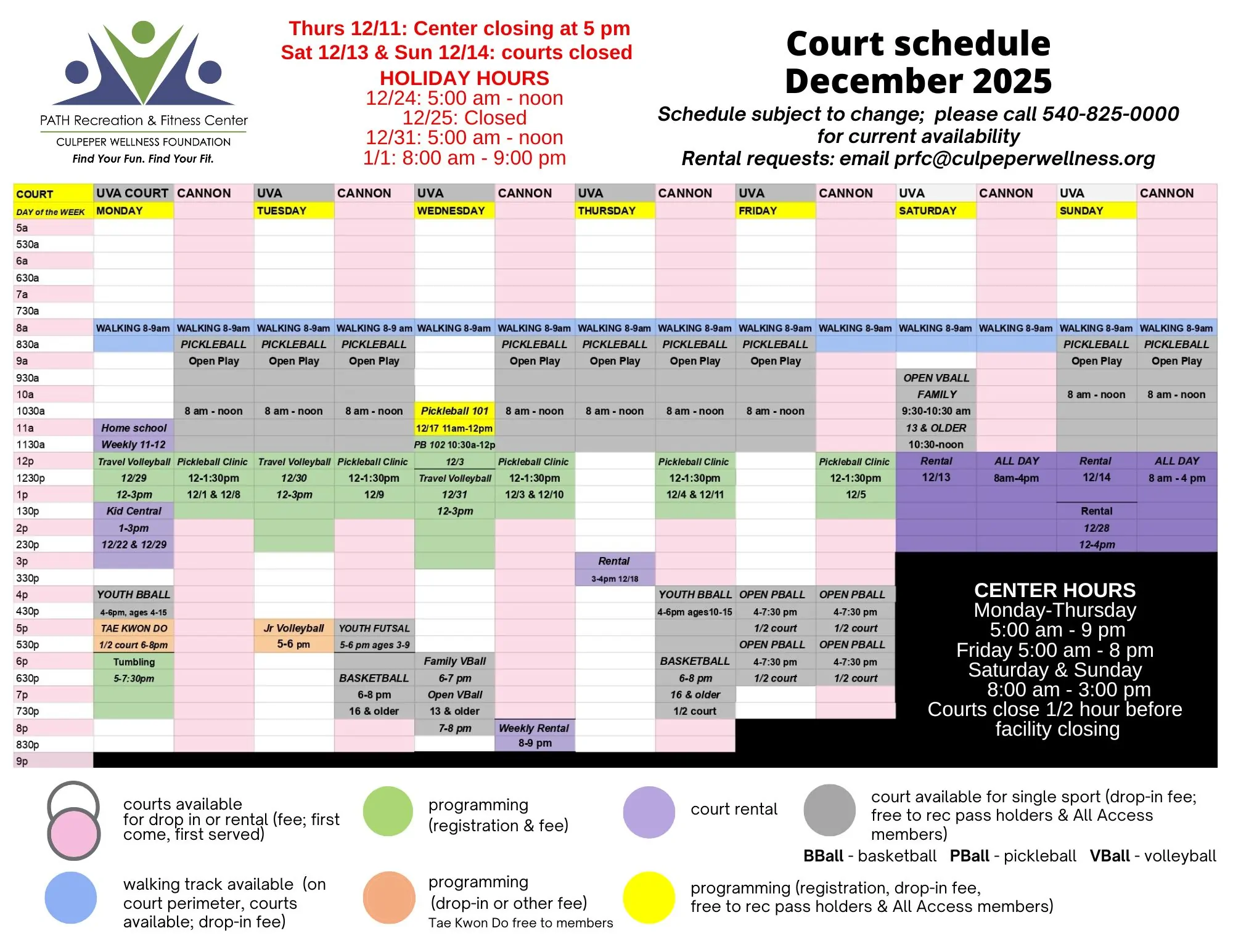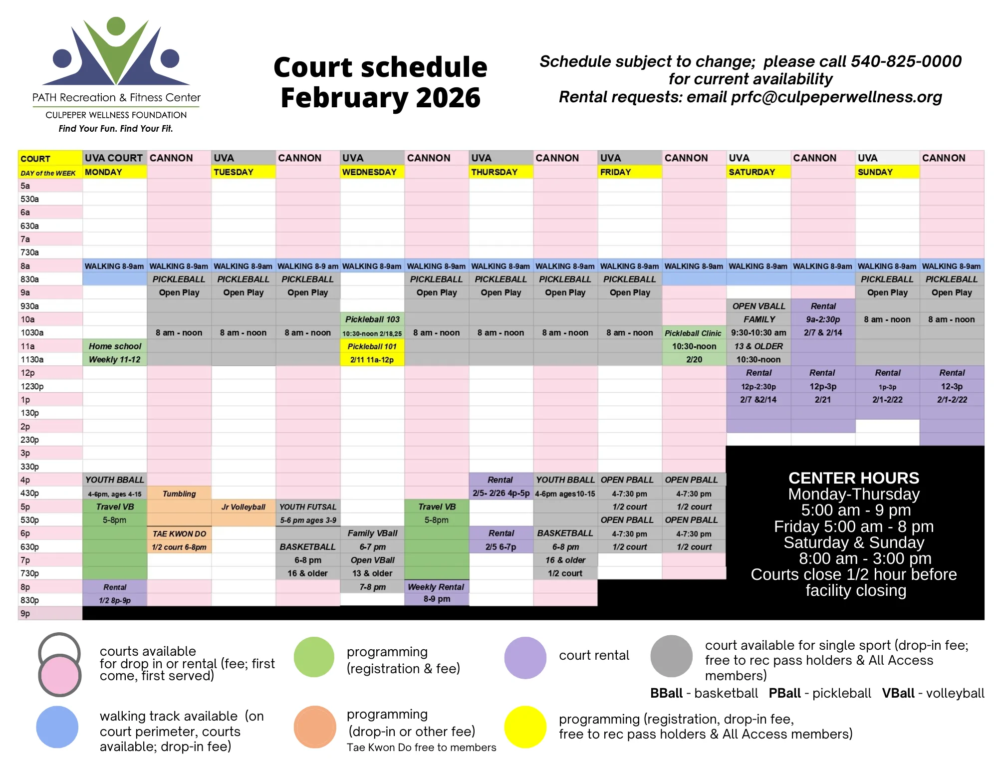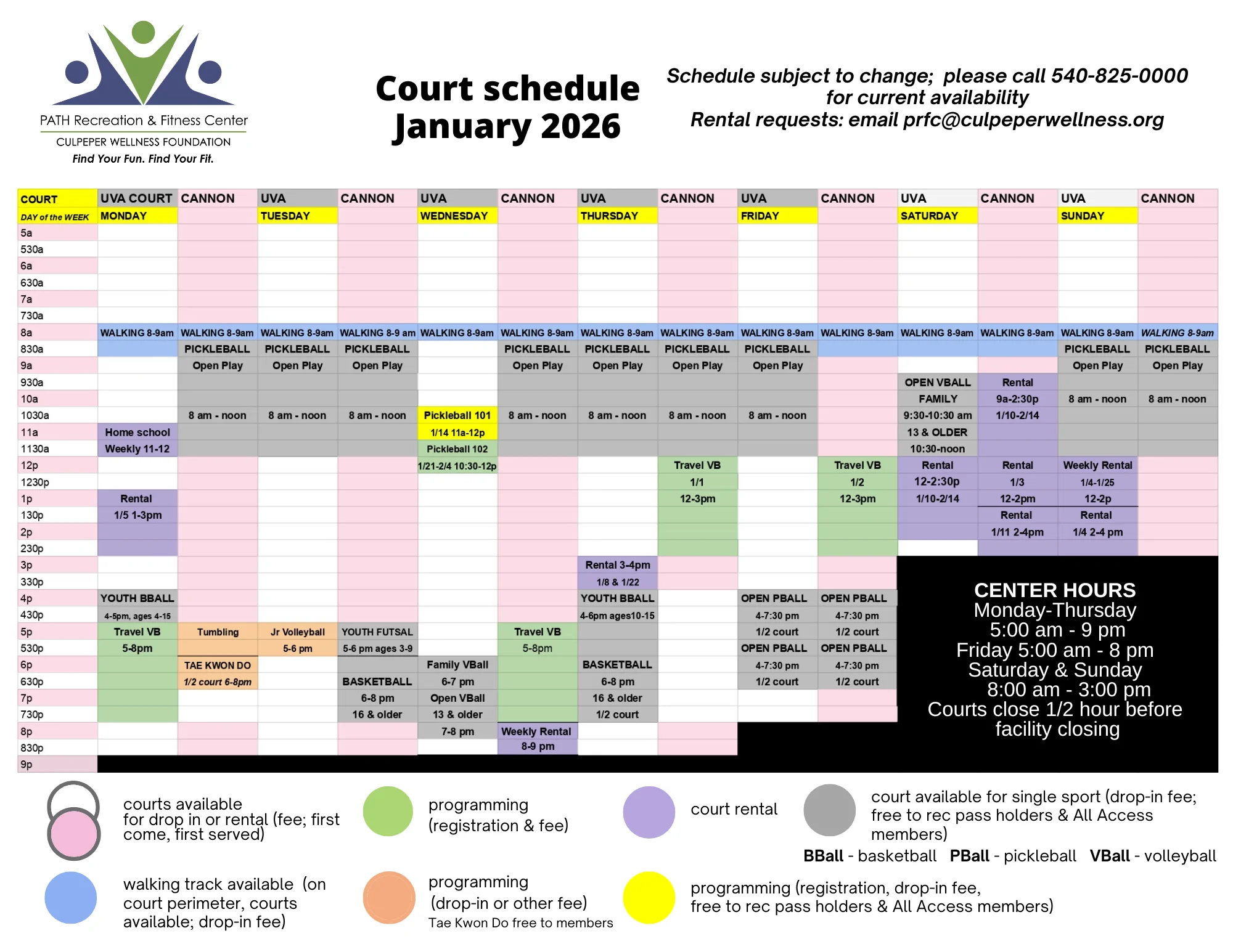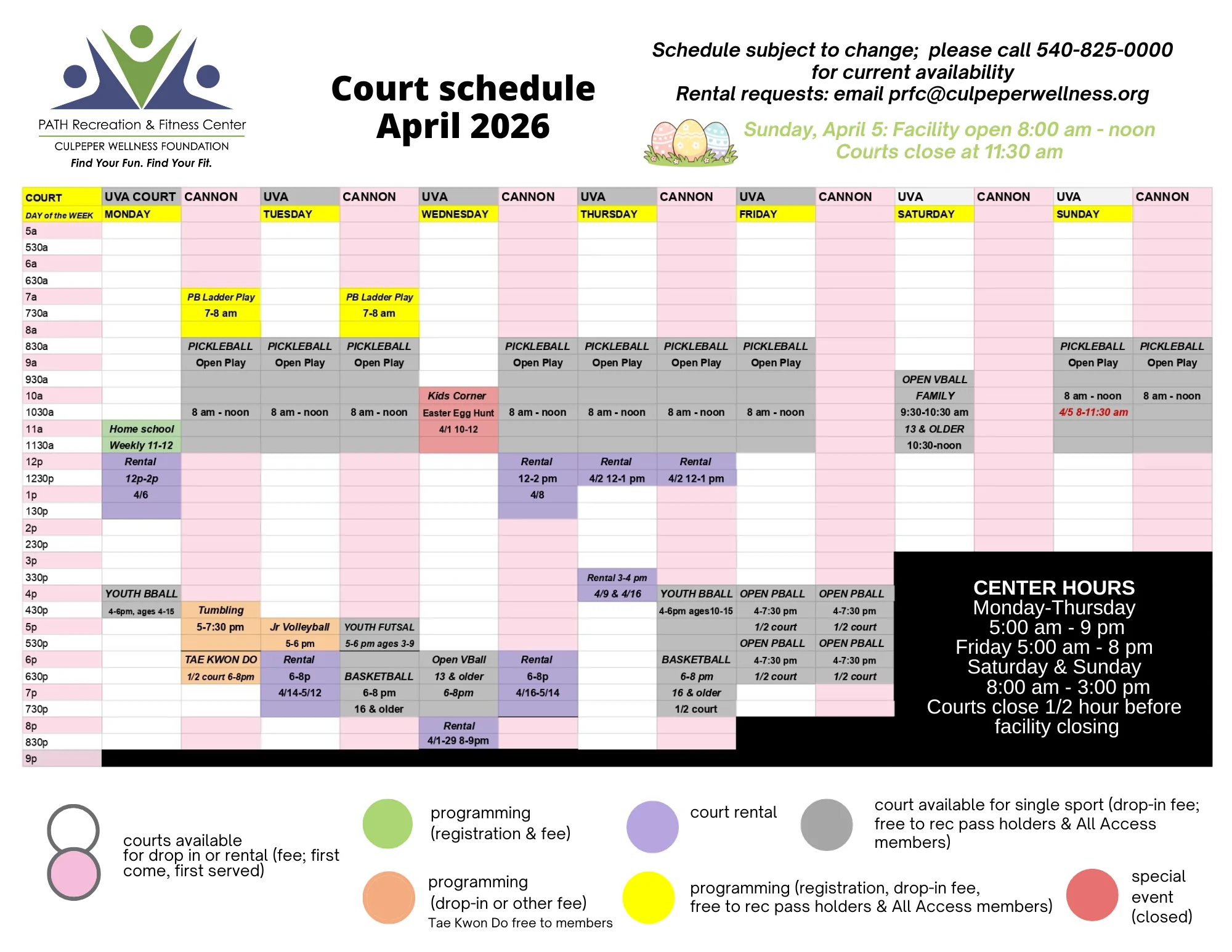 During these times, court space is available on a first come, first served basis (center drop-in fee; free to All Access members). Please call ahead to confirm availability.