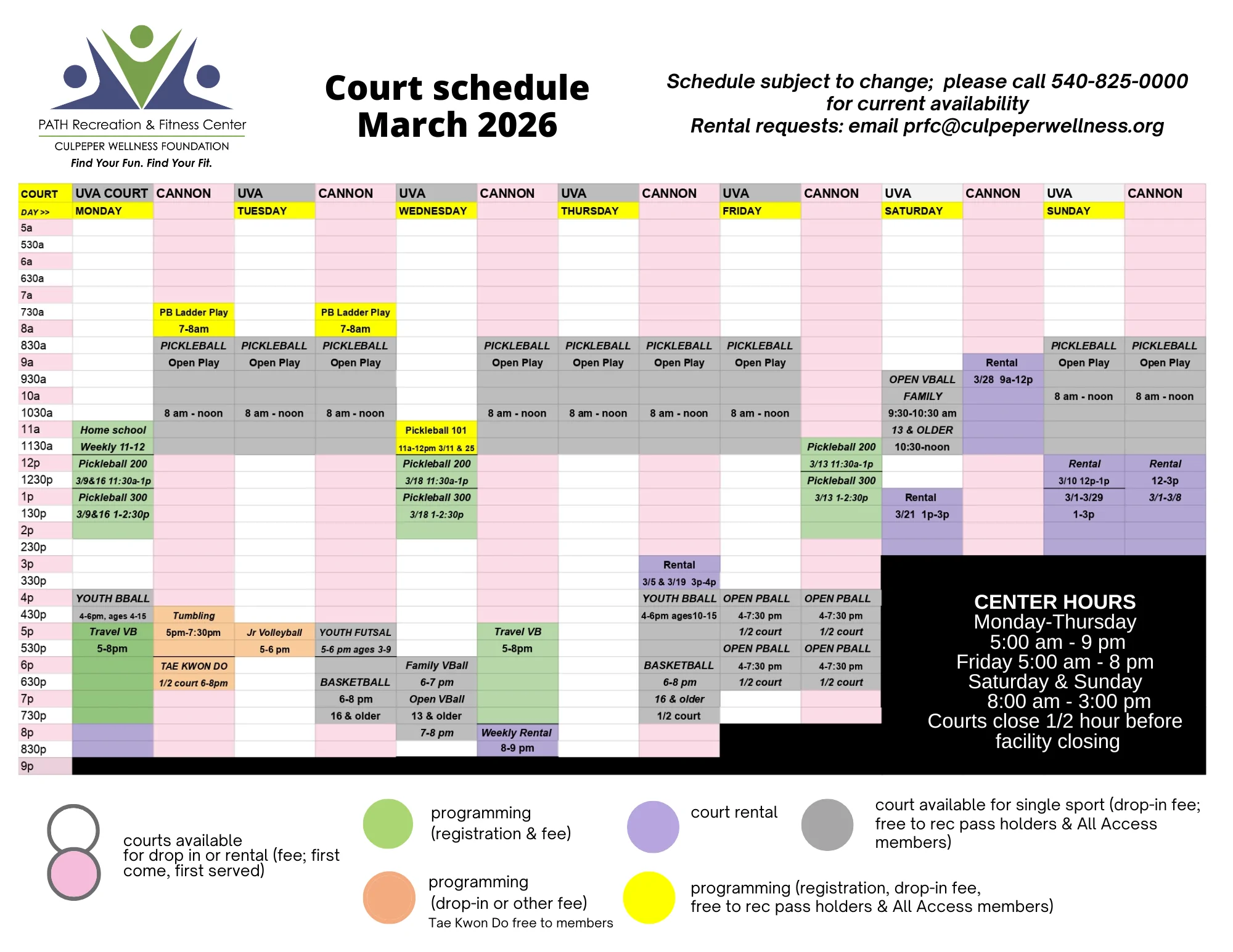 Our courts are multifunctional and serve a variety of sports and activities through drop-in play, programming, and rentals. For the latest information on court availability, please call our desk: 540-825-0000. Happy to help you find your fun!